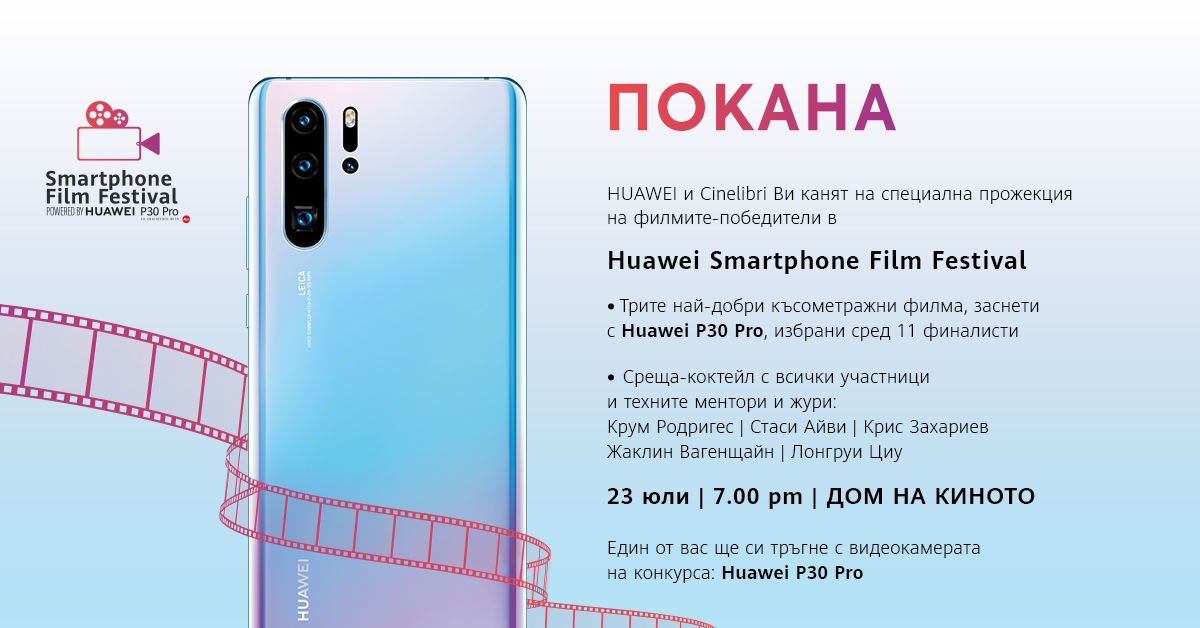 /КРОСС/ Huawei България и Cinelibri канят всички фенове на марката и любители на киното на специална прожекция на трите филма-победители в Huawei Smartphone Film Festival, на 23 юли, вторник, от 19 часа в Дома на киното.