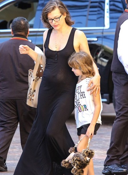 /КРОСС/ Мила Йовович показа бременно коремче. Папараци успяха да я уловят пред супермаркет в Лос Анджелис, по-късно бе засечена на разходка с дъщеря си в Бевърли Хилс. Актрисата бе облечена с черна плътно прилепнала полупрозрачна рокля, през която и с невъоръжено око се вижда заобленият й корем.