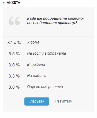 /КРОСС/ 87,4% от читателите на Агенция КРОСС избраха домашния уют за посрещането на едни от най-хубавите празници в календара ни - Коледа и Нова година. Данните са от анкетата „Къде ще посрещнете коледно-новогодишните празници?" , публикувана на сайта ни. В нея се включиха 364 души.
