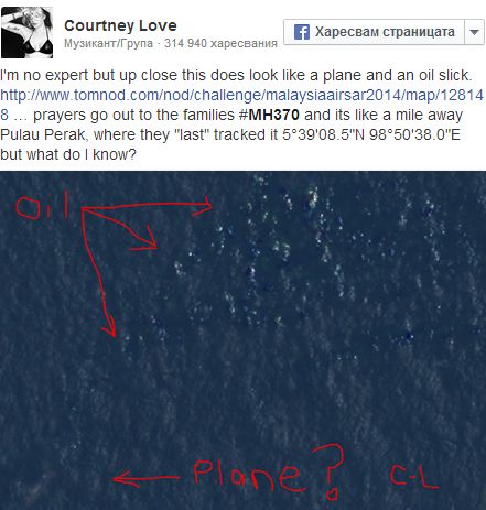 /КРОСС/ Рокаджийката Къртни Лав като че ли ще се окаже най-близо до разгадаването на голямата мистерия около безследно изчезналия на 8 март самолет на Малайзийските авиолинии между Куала Лумпур и Пекин, който все още не е намерен.