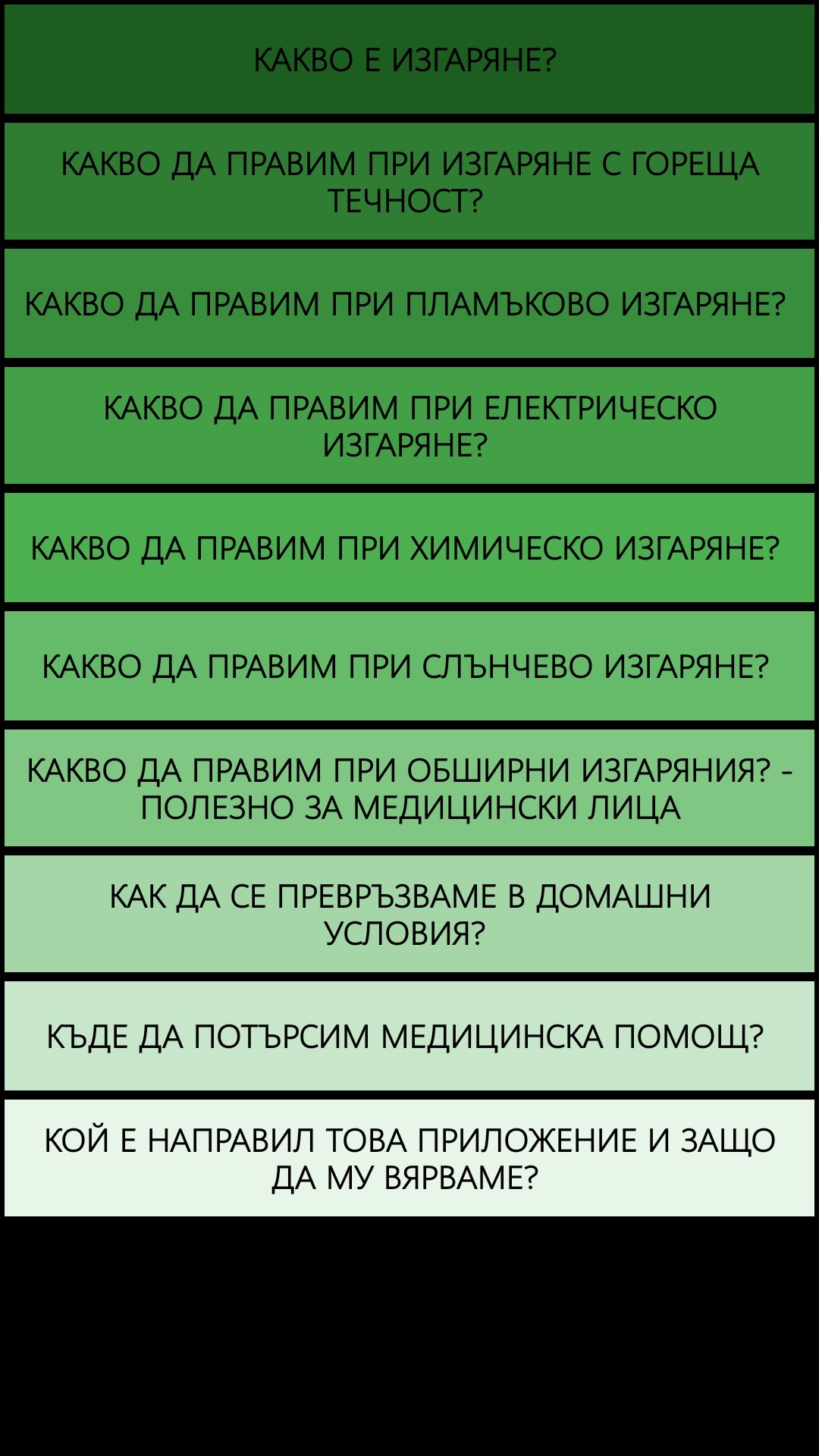 След инсталация мобилното приложение предоставя висококачествена и удобна за употреба информация, която потребителите могат лесно да намерят, разберат и приложат без да е нужна интернет връзка. Формулирали сме точни, ясни и илюстрирани насоки за оказване първа помощ при изгаряне в зависимост от механизма-от гореща течност, пламъкови, електрически, химически и слънчеви изгряния. Освен „какво да се прави" в случай на изгаряне, сме дали отговор и на въпроса „какво да не се прави", както и кога и къде да се потърси специализирана помощ.