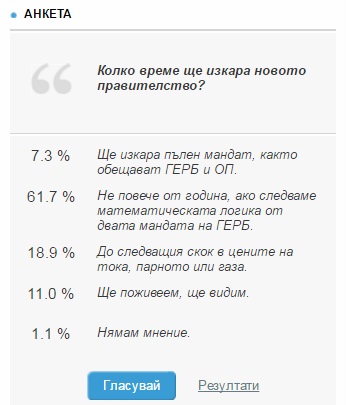 /КРОСС/ 61,7% от читателите на Агенция КРОСС, включили се в седмичната ни анкета, предположиха, че новото правителство ще изкара по-малко от година, като се аргументират с математическата логика след предходните два кабинета, които се задържаха 3 и 2 години. В допитването се включиха 355 души.