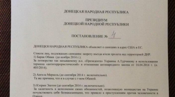 „Новости Донбасса", разпространи въпросния документ, в който се посочва, че ДНР въвежда санкции по отношение на редица политици от САЩ и Европейския съюз, сред които президентът на САЩ Барак Обама, германският канцлер Ангела Меркел, върховният представител на ЕС за външната политика Катрин Аштън и британският премиер Дейвид Камерън.