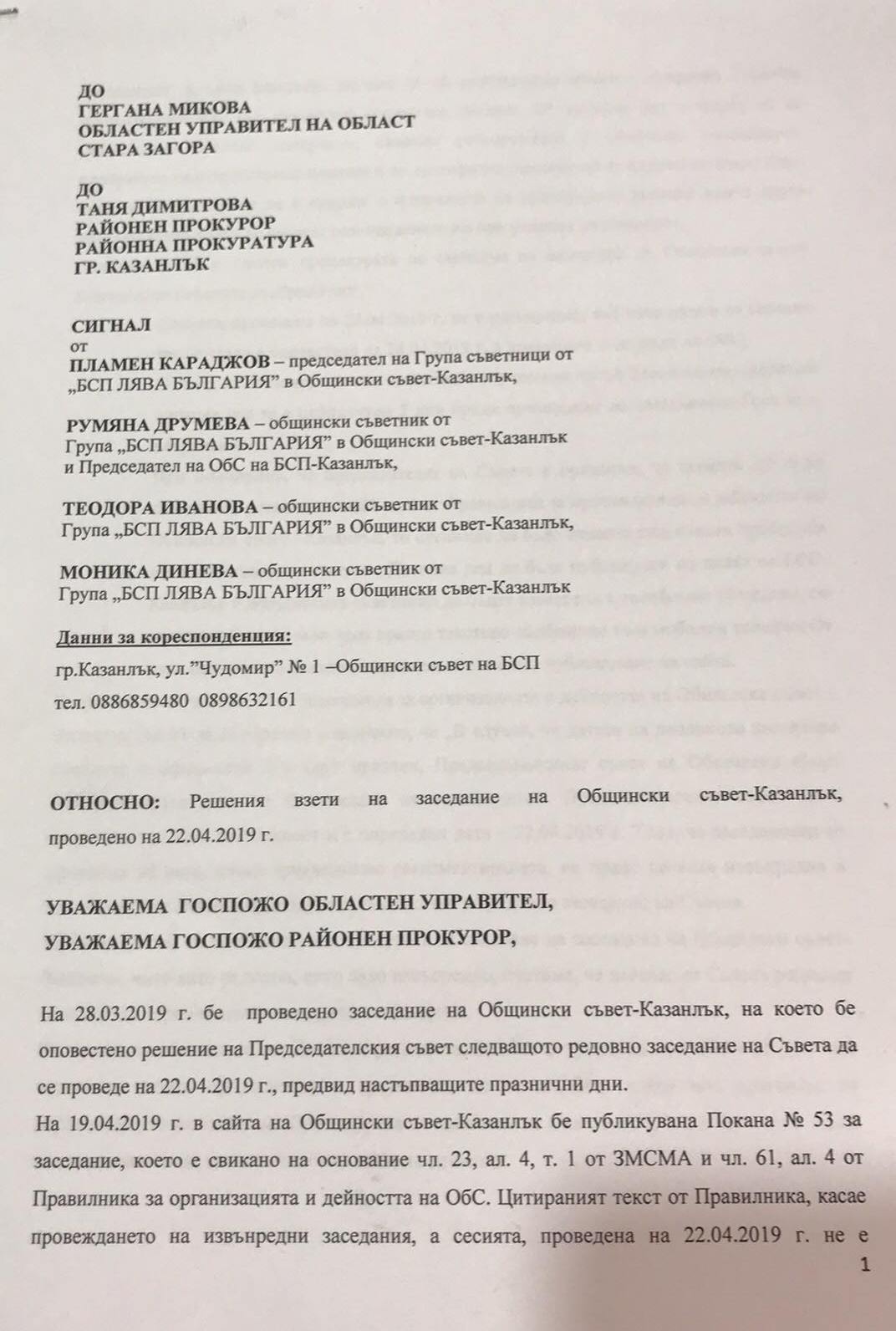 /КРОСС/ БСП-съветниците внесоха сигнал до Областния управител и до Районна прокуратура за незаконосъобразното заседание на местния парламент в Казанлък, проведено на 22 април т.г. То бе свикано като извънредно с 33 точки дневен ред, като 25 от тях - продажби на общинска собственост.