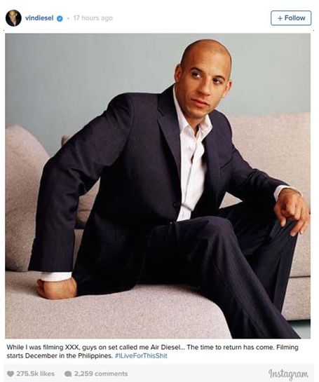 „Докато снимахме „Трите Хикса" на снимачната площадка ме наричаха Еър Дизел. Дойде време да се завърна в него. Снимките започват през декември във Филипините."
