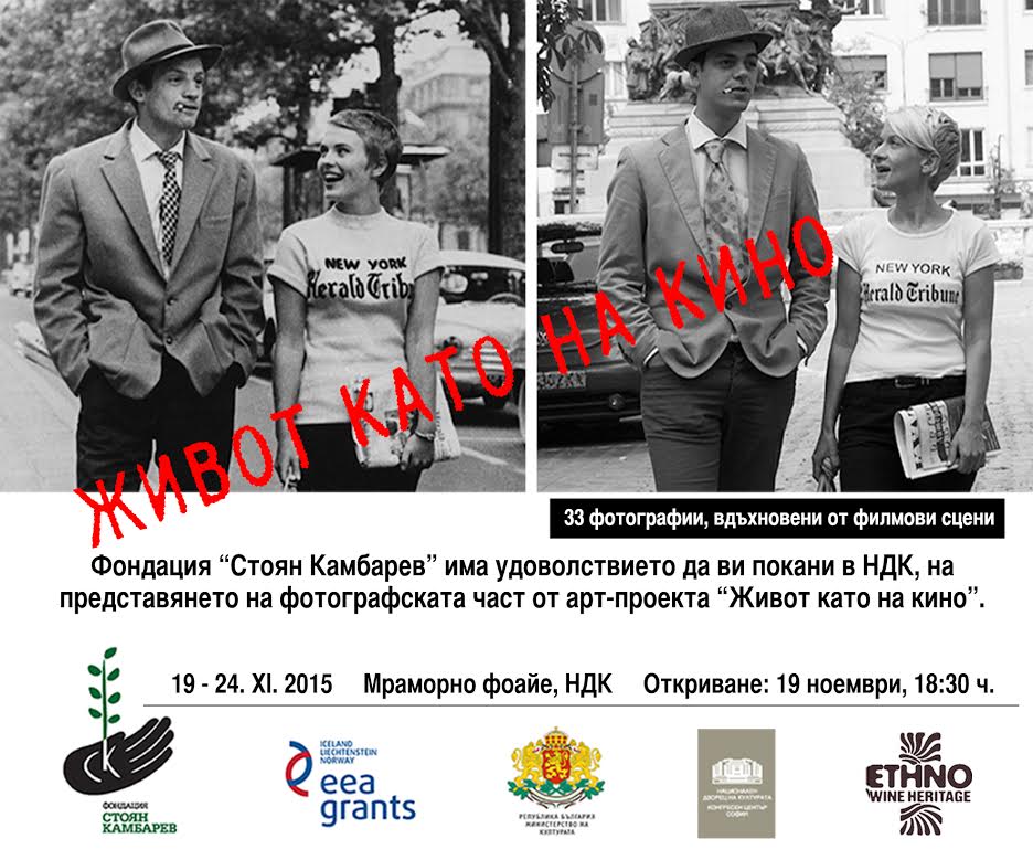/КРОСС/На 19- ти ноември, четвъртък, от 18:30 ч. в Мраморното фоайе на НДК ще се състои официалното представянето на първата част от проекта „Живот като на кино" на Фондация „Стоян Камбарев"- откриването на Фотографската изложба, която включва 33 оригинални фотографии, вдъхновени от известни филми от световното и европейско кино. Изложбата ще може да се види до 24-ти ноември включително.