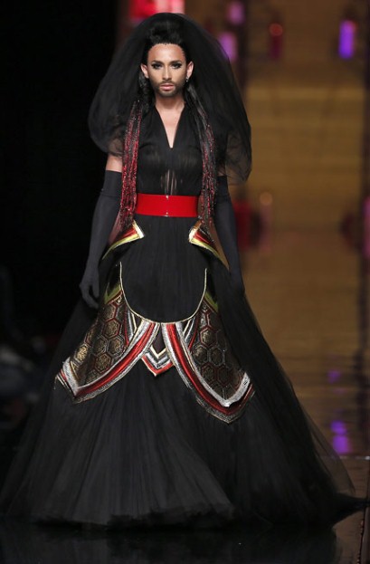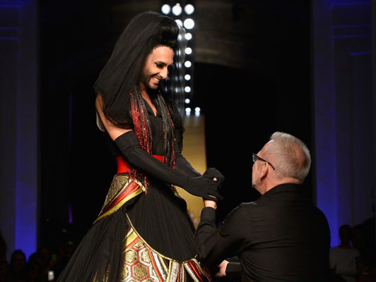 "Срещнах Кончита преди две години на едно от моите ревюта. Харесвах нейния образ, и когато научих, че тя ще представя Австрия на "Евровизия", бях възхитен. И бях безумно щастлив, когато тя спечели", коментира Готие дебюта на "брадата жена"на подиума.