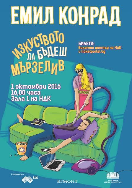 Стендъп комеди шоуто ще бъде и официалната премиера на третата книга на Емил Конрад с едноименното заглавие, която ще излезе в официална продажба на 8 октомври. След представлението зрителите ще могат да се срещнат лично с влогъра, както и да закупят „Изкуството да бъдеш мързелив" с личен автограф. Стендъп комедията се организира от издателство „Егмонт".