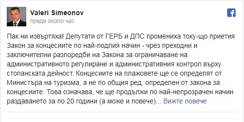 "Концесиите на плажовете ще се определят от Министъра на туризма, а не по общия ред, определен от Закона за концесиите. Това означава, че ще продължи по най-непрозрачен начин раздаването за по 20 години (а може и повече) на приближени фирми и групировки. Явно при това ръководство на Министерството, България няма да има съвременен и прозрачно-регламентиран туризъм. Това е поредният саботаж на опитите за въвеждане на нормално управление и реална конкуренция", обяснява недоволството си Валери Симеонов.
