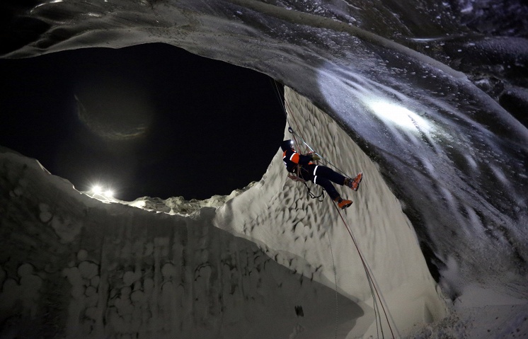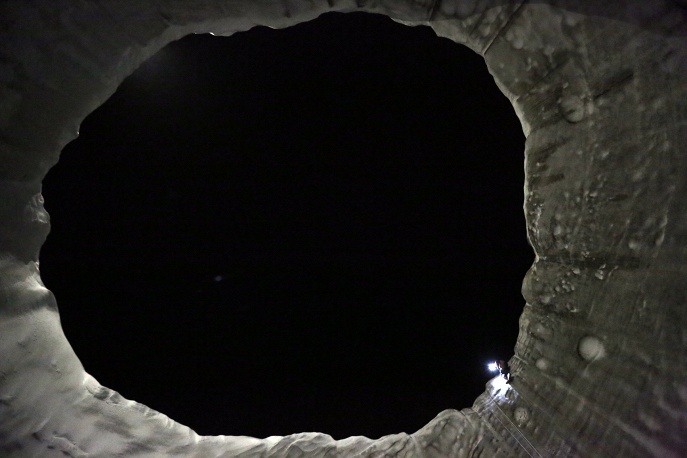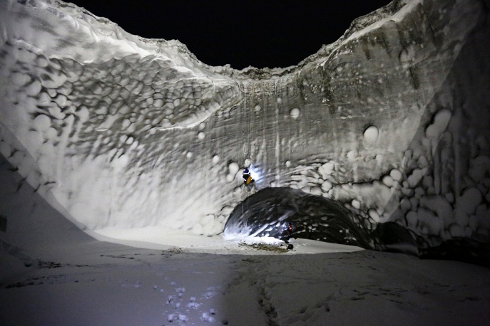Според ИА „Север-пресс”, групата изследователи се спуснали на дъното на кратера, за да го заснемат отвътре, както и да вземат проби от повърхността му. Учените открили там замръзнало езеро с дълбочина около 10,5 м.