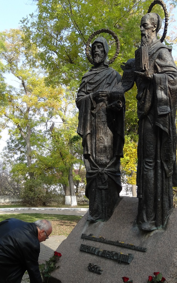 Фолклористът д-р Николай Никон пред паметника на братята Св. Св. Кирил и Методий в Севастопол. Оля Ал-Ахмед, Исак Гозес