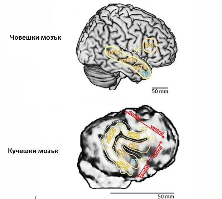 Но има и различия. При хората част от тази зона не реагира на звуци, различни от човешкия глас, докато при кучетата невроните в тази зона реагират и на други дразнители. Наличието на този център обяснява защо кучета са толкова силно привързани към стопанина си и са в състояние да бъдат съпричастни с него.
