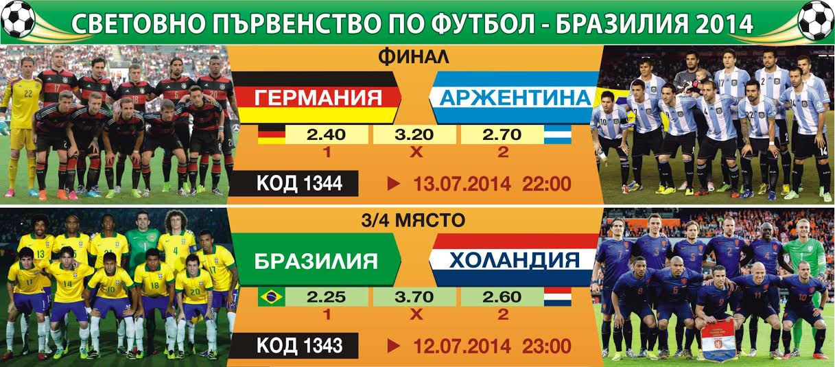 /КРОСС/ „Еврофутбол" счита, че Германия ще спечели титлата от Световното първенство по футбол в Бразилия - това личи както от коефициентите за шампион, където Бундестимът е с 1.70, а опонента им Аржентина с 2.00, така и от ставките за самия финален сблъсък: