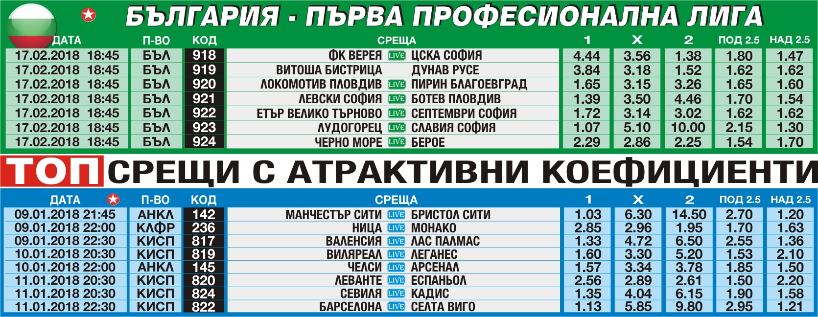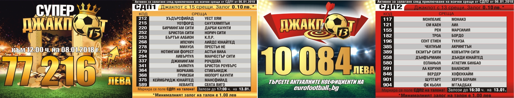 30-те срещи от МАКСГОЛ може да намерите тук. Суперджакпот 15 към 09.01.2018 г. е на стойност 77 228 лева, а срещите от него можете да намерите тук. Джакпотът с 13 срещи продължава да предизвиква всички желаещи да изпробват знанията си - началната сума е 10 000 лева, а срещите може да намерите тук.