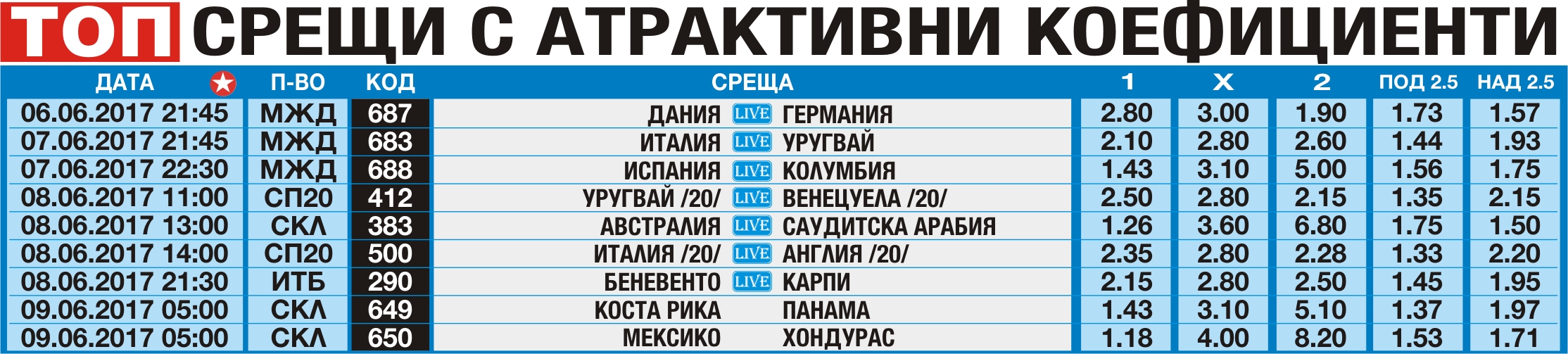 Италия - Уругвай Сингъл, Live, ТОП „1"-2.00 „Х"-2.80 „2"-2.75