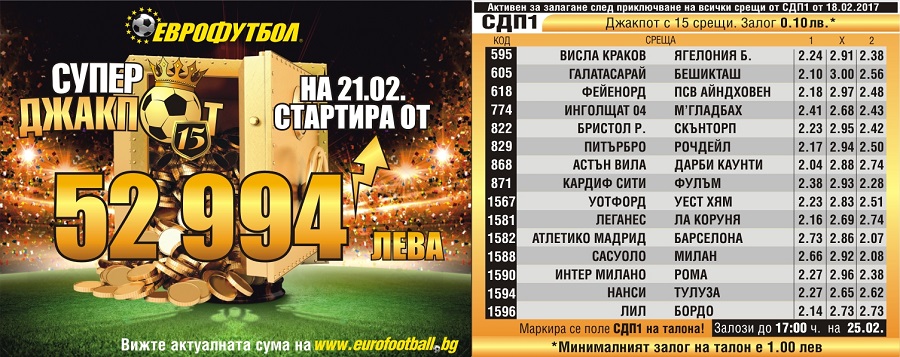 „Еврофутбол" определи сумата от 52 994 лева за СУПЕРДЖАКПОТ 15, а всички срещи, които са включени в него, можете да видите тук.