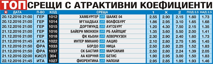 Атрактивните футболни коефициенти на „Еврофутбол" направиха страхотен предколеден подарък на участник от Балчик, който пусна талон за 10 лева в събота (17.12.2016 г.) в букмейкърския пункт на ул. „Ген. Заимов" №2 и с прогноза за два мача: КС Волунтари - УФР Клуж за КИ „1" и ШФ Лоте - Магдебург за Сбор голове - гост 3+, спечели 15 226,18 лева! В същия ден играч от столицата взе 9 569,63 лева с 500 лева за крайния изход на шест срещи в права колонка, а друг - пак от София, прибра 7 143,74 лева със 100 лева за пет двубоя и същото предвиждане. Техен градски пък показа познания на футболна тематика в неделя и си тръгна с 3584,50 лева срещу фиш за пет лева и предвиждане за четири сблъсъка в права колонка.