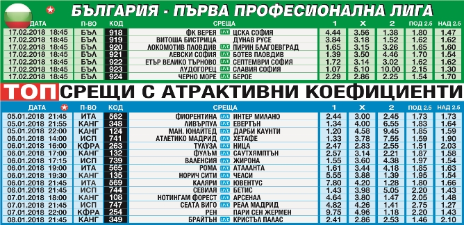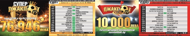 30-те срещи от МАКСГОЛ може да намерите тук. Суперджакпот 15 към 05.01.2018 г. е на стойност 77 058 лева, а срещите от него можете да намерите тук. Джакпотът с 13 срещи продължава да предизвиква всички желаещи да изпробват знанията си - началната сума е 10 000 лева, а срещите може да намерите тук.