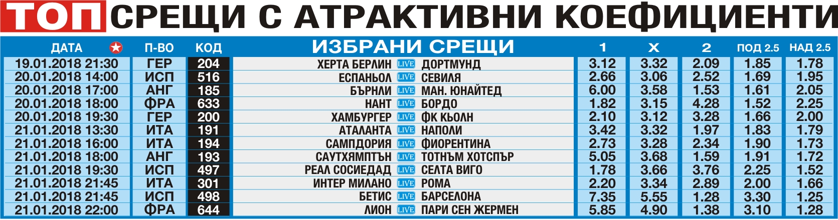 30-те срещи от МАКСГОЛ може да намерите тук. Суперджакпот 15 към 19.01.2018 г. е на стойност 77 742 лева, а срещите от него можете да намерите тук. Натрупаната сума в Джакпота с 13 срещи е 10 191 лева, а мачовете, с които можете да играете за него, ще откриете тук.