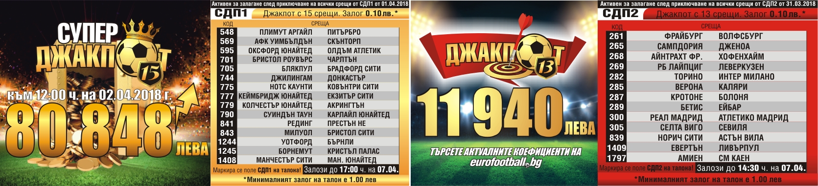 30-те срещи от МАКСГОЛ можете да намерите тук. Суперджакпот 15 към 11.30 часа на 03.04.2018 г. е на стойност 80 858 лева, а срещите от него можете да намерите тук. Натрупаната сума в Джакпота с 13 срещи е 11 940 лева, а мачовете, с които можете да играете за него, ще откриете тук.