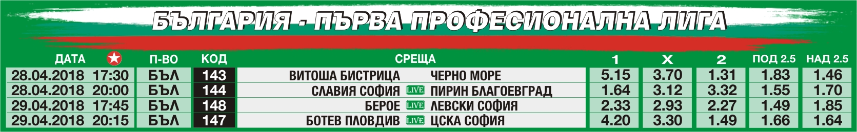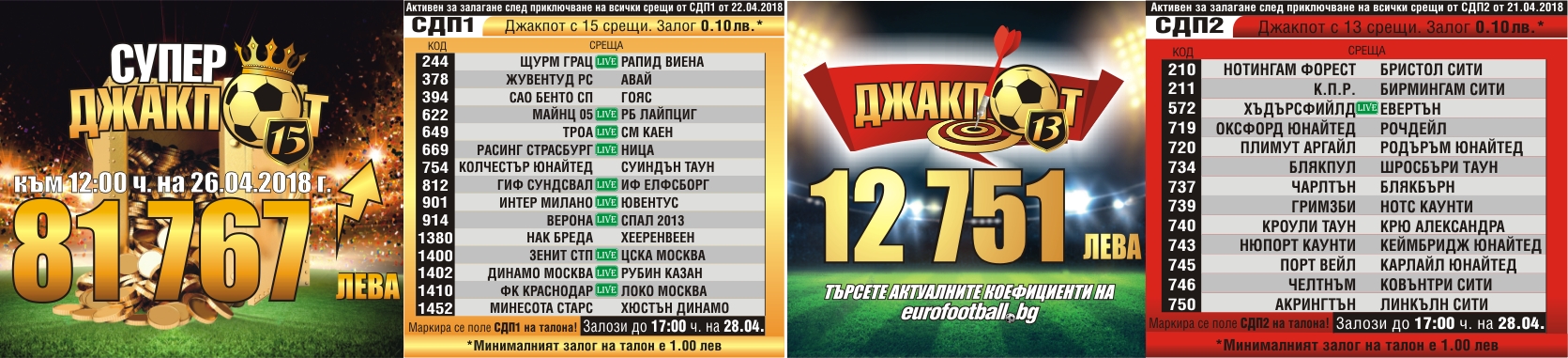 30-те срещи от МАКСГОЛ можете да намерите тук. Суперджакпот 15 към 12.30 часа на 27.04.2018 г. е на стойност 81 832 лева, а срещите от него можете да намерите тук. Натрупаната сума в Джакпота с 13 срещи е 12 751 лева, а мачовете, с които можете да играете за него, ще откриете тук.