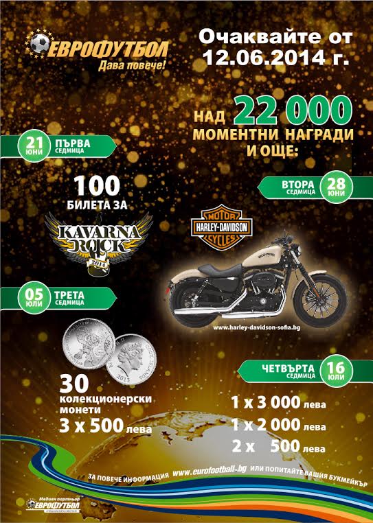 /КРОСС/ „Еврофутбол" ще зарадва някой от своите участници с невероятен подарък за Световното първенство по футбол - легендарния мотоциклет Harley-Davidson. Изненадата е част от най-новата инициатива на компанията по повод старта на големия футболен форум. През четирите седмици на кампанията ще бъдат раздадени и над 22 000 моментни награди, 100 билета за Каварна Рок Фест, 30 колекционерски монети, пет суми от по 500 лева и по една от 3 000 лева и 2 000 лева.