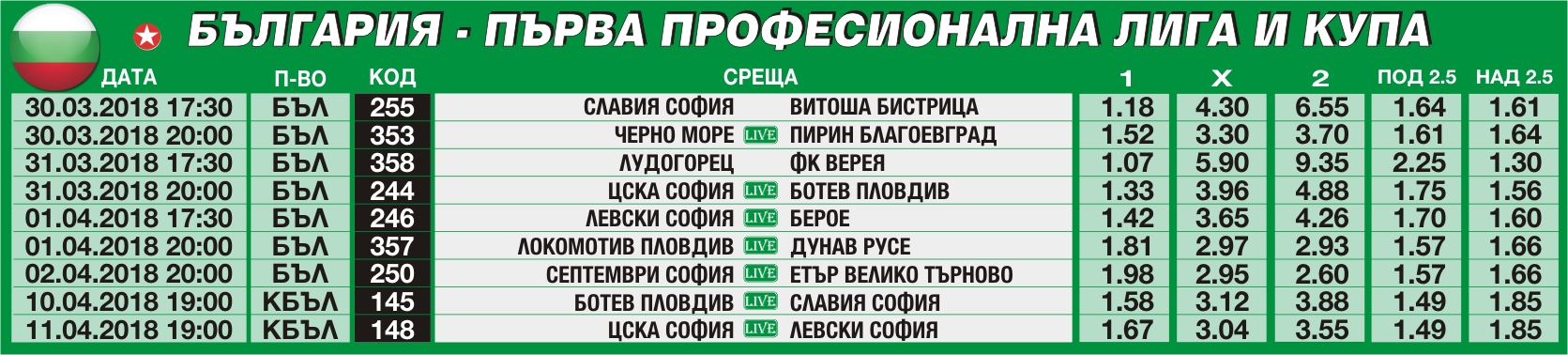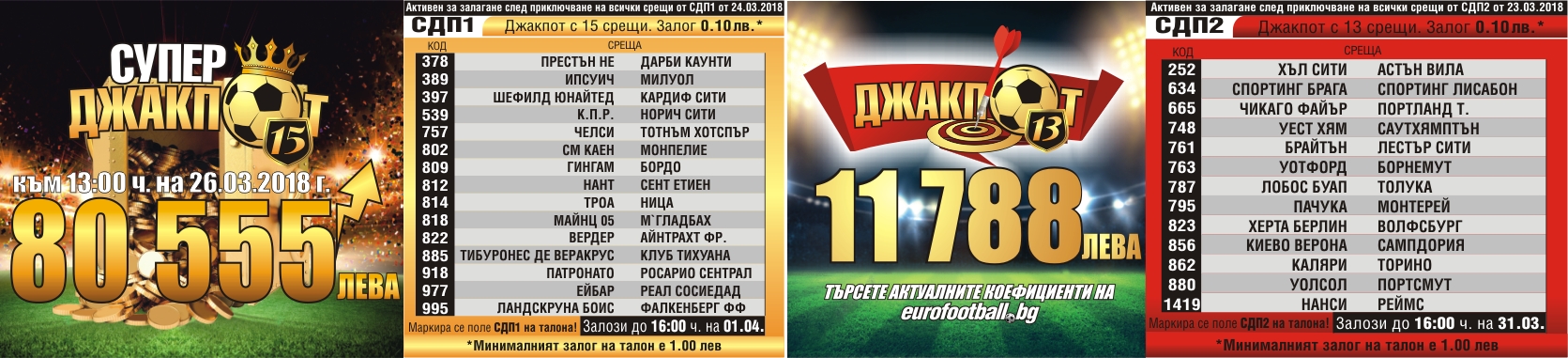 30-те срещи от МАКСГОЛ може да намерите тук. Суперджакпот 15 към 11.30 часа на 27.03.2018 г. е на стойност 80 569 лева, а срещите от него можете да намерите тук. Натрупаната сума в Джакпота с 13 срещи е 11 788 лева, а мачовете, с които можете да играете за него, ще откриете тук.
