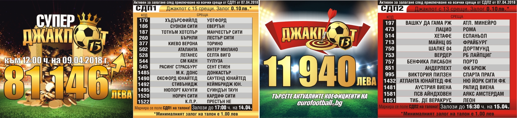 30-те срещи от МАКСГОЛ можете да намерите тук. Суперджакпот 15 към 14.30 часа на 10.04.2018 г. е на стойност 81 152 лева, а срещите от него можете да намерите тук. Натрупаната сума в Джакпота с 13 срещи е 12 326 лева, а мачовете, с които можете да играете за него, ще откриете тук.