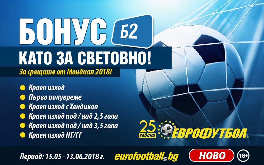 „Еврофутбол" предлага специални бонуси за Световното първенство по футбол при направени прогнози за 3 и повече мача. Кампанията е от днес до 13 юни, като са включени предвиждания за Краен изход, Краен изход с ХК, ГГ/НГ, Под / Над 2,5; 3,5 гола и Първи / Следващ гол. В сайта новите бонуси са отбелязани в синьо с Б2, като правилата и процентите съответстват на настоящата бонус листа. Вижте срещите от Бонус 2 тук.