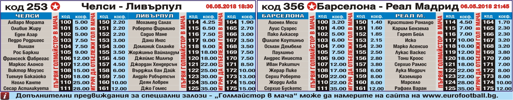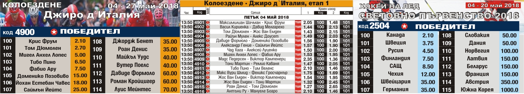 30-те срещи от МАКСГОЛ можете да намерите тук. Суперджакпот 15 към 12.00 часа на 04.05.2018 г. е на стойност 82 275 лева, а срещите от него можете да намерите тук. Натрупаната сума в Джакпота с 13 срещи е 12 895 лева, а мачовете, с които можете да играете за него, ще откриете тук.