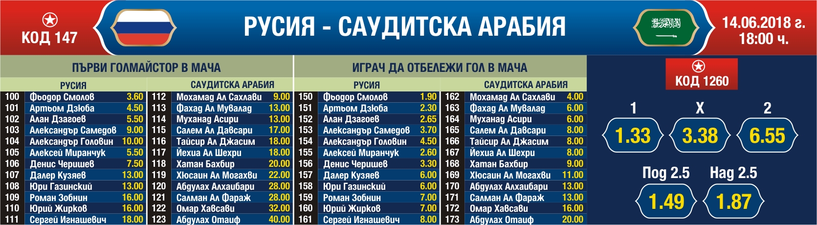 Русия - Саудитска Арабия тук Сингъл, Live, „1"- 1.28 „Х"- 3.50 „2"- 8.00