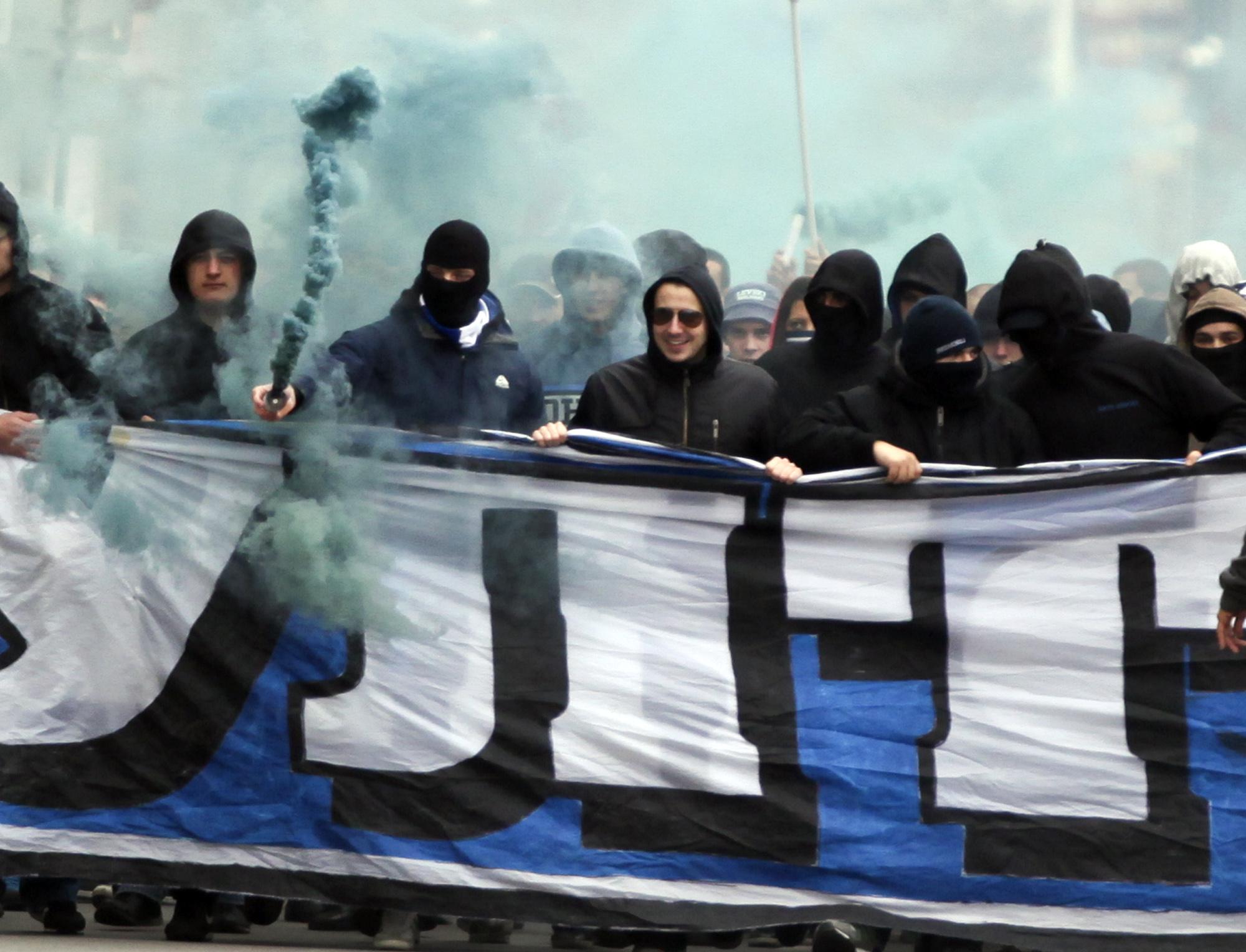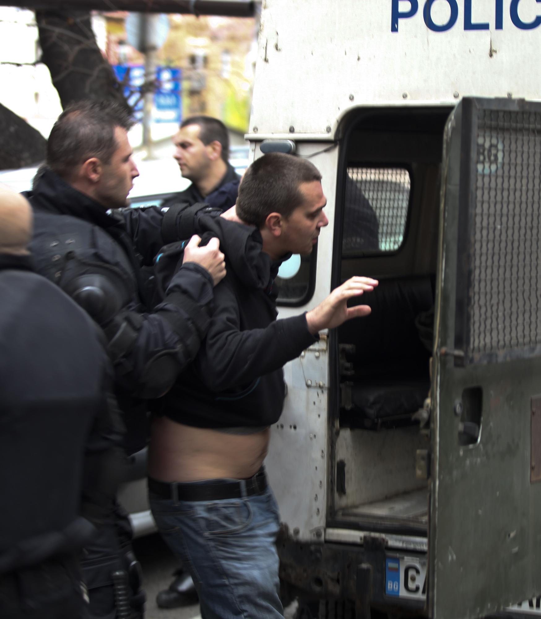 София /КРОСС/ Полицаи задържаха "син" ултрас на пресечката на бул. "Тодор Александров" и улица "Георг Вашингтон" още в началото на шествието на привържениците на футболния "Левски".