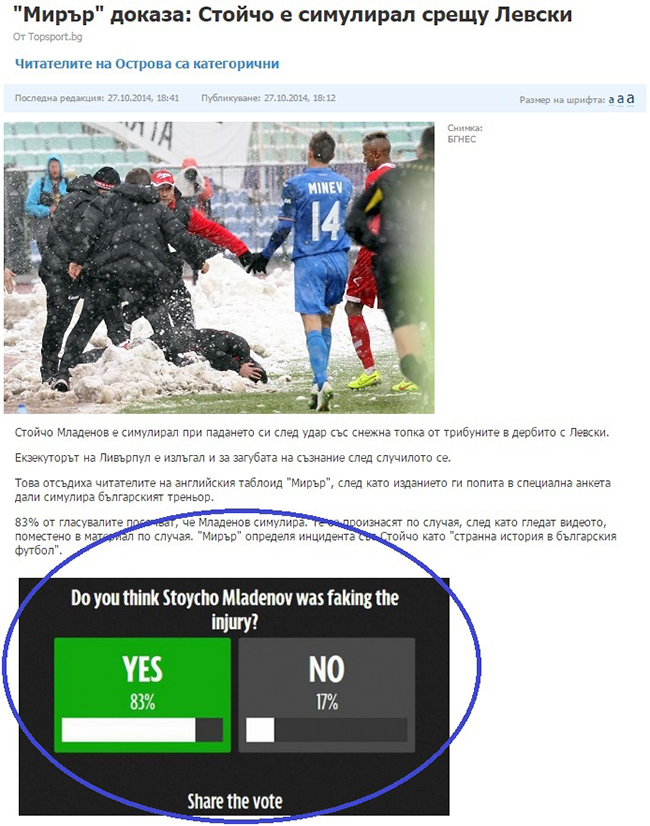 Резултатът го видя цяла България: Канонада от бомби, факли и ракети към резервната скамейка на ПФК Левски и сектора на гостуващия отбор, могат да се определят, цитираме като „брутален акт на агресия". Грозните сцени за късмет се разминаха без тежко пострадали. Мачът бе прекъсван, а около ВИП входовете стояха десетки полицаи в опит да предпазят официалните лица, а сега за една снежна топка - „смешен плач" три дни. Да не забравяме, че децата играят на бой със снежни топки, за удоволствие без да си причиняват „вреди от всякакъв характер". Нищо ново - след „директивата и организацията", следва медицинското.