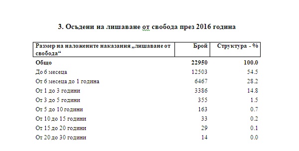 В структурата на осъдените лица по наложени наказания най-голям е относителният дял на лишените от свобода. През 2016 г. те са 22 950, или 81.1% от общия брой на осъдените лица. Най-висок е относителния дял на лишените от свобода за срок до 6 месеца (54.5%) и от 6 месеца до 1 година - 28.2% от всички осъдени на лишаване от свобода.