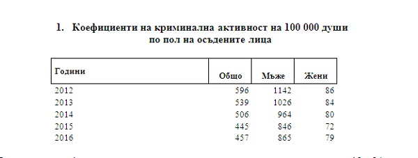Коефициентът на криминална активност на мъжете е 865 на 100 000 души от наказателноотговорните мъже, а на осъдените жени - 79 на 100 000 души от съответното население.