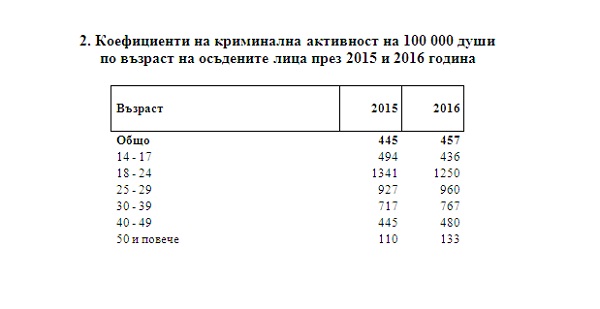 Най-висок е коефициентът на криминална активност за възрастовата група 18 - 24 години -1 250 осъдени на 100 000 души от съответното население. С нарастване на възрастта стойността на коефициента намалява и за лицата на възраст 50 и повече години той е 133 на 100 000 души от съответното население.