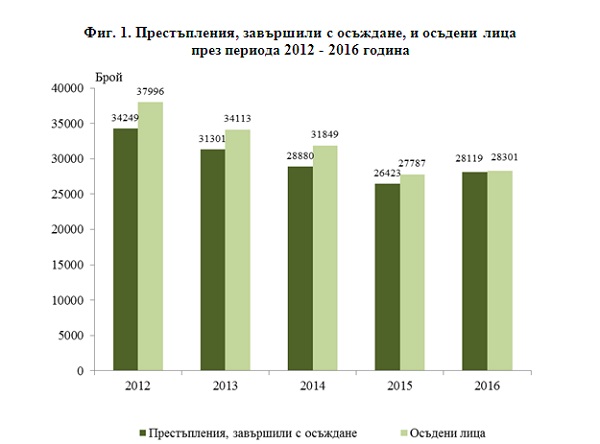 Броят на осъдените лица с влезли в сила присъди през 2016 г. е 28 301, като в сравнение с 2015 г. нараства с 1.8%.