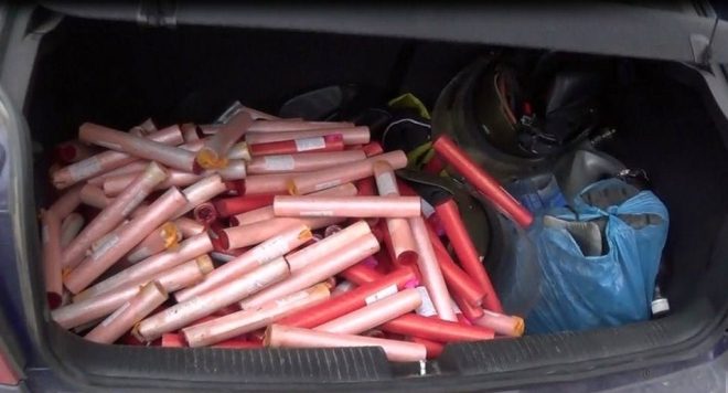 /КРОСС/ Пресслужбата на СДВР разпространи снимки на откритата пиротехника в сектор "Г" на Националния стадион "Васил Левски" преди дербито Левски - ЦСКА в събота. Преди започването на футболната среща чрез използване на специални средства - полицейски кучета и техника, в района на стадиона бяха открити над 200 бр. пиротехнически изделия.