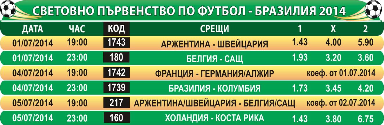 Аржентина и Белгия ще отидат на 1/4-финалите на Световното първенство по футбол в Бразилия - това е другата новина, произхождаща от коефициентите на „Еврофутбол". „Гаучосите" излизат срещу Швейцария с претенцията за фаворит - 1.55 за тях срещу 6.00 за европейците и 3.80 за равенство. Белгия пък ще пребори САЩ с 2.10 срещу 3.25 за американците и 3.25 за „Х".