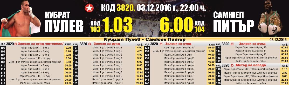 Кубрат Пулев ще даде до 3 рунда на съперника си Самюел Питър в спора за интерконтиненталната титла на Световната боксова асоциация в тежка категория - това определи „Еврофутбол" за двубоя, който е на 03.12.2016 г. от 22.00 часа в „Арена Армеец" в София. Коефициентът за това Кобрата да победи в интервала от 1-3 рунд е 2.00. Иначе българският букмейкър дава категорично предимство на родния ни боксьор - 1.03 за негов успех, срещу 5.50 за нигериеца. Всички опции за предвиждане на този интересен сблъсък можете да намерите тук.