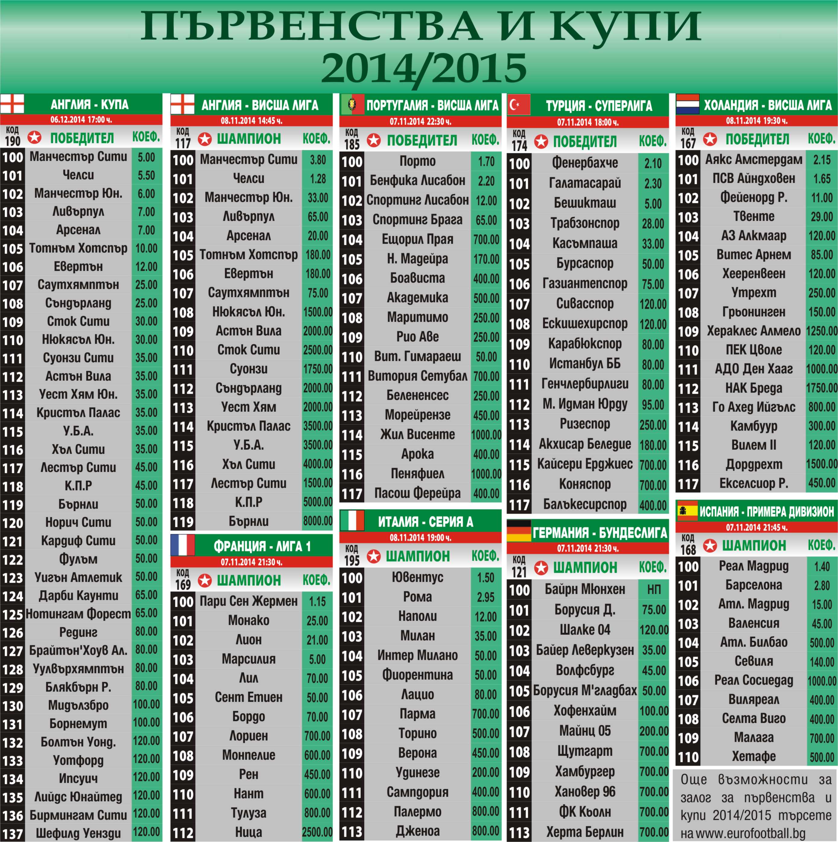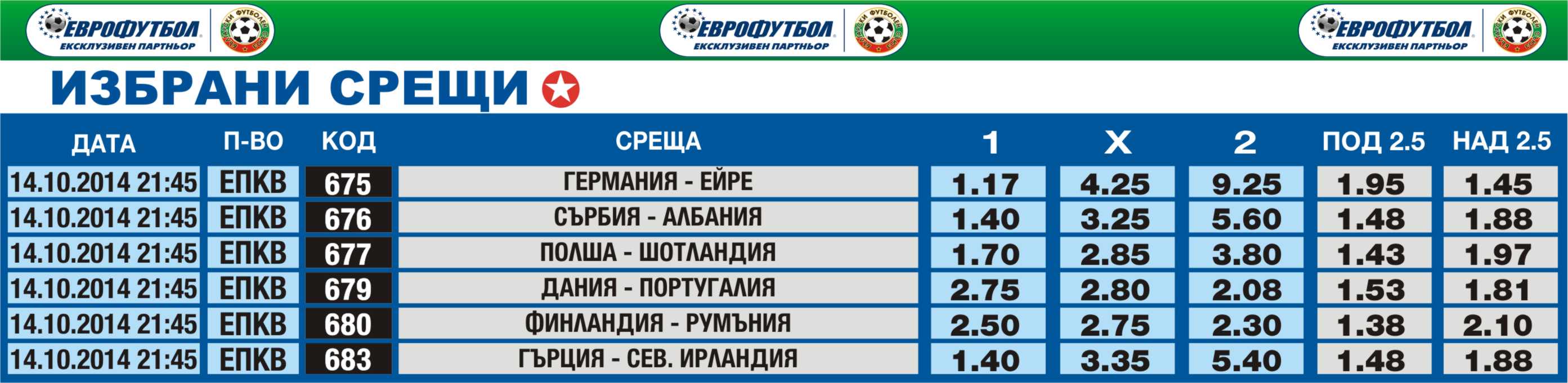 Участниците в „Еврофутбол" могат да се похвалят с хубави печалби от вчерашния ден. В пункта н ул. „27-ми юли" №15а във Варна привърженик на футбола написа талон с 11 мача в права колонка и заложи 40 лева, което му осигури печалба от 5 411,72 лева. Той е играл за крайния изход „1" за следните двубои: УТК Кахамарка - Сан Симон, Легия Варшава (Пол.) - Металист Х. (Укр.), Динамо Киев (Укр.) - Олборг (Дан.), Наполи (Ит.) - Йънг Бойс (Швц.), Волфсбург (Гер.) - ФК Краснодар (Рус.), Чакарита - Браун Де Адрогуе, Орхус ГФ - Вейле БК и Бешикташ (Тур.) - Партизан (Сърб.) и „2" за срещата Панатинайкос (Гър.) - ПСВ Айндховен (Хол.) и за Над 2,5 гола за Севиля (Исп.) - Стандарт Лиеж (Бел.) и ФК Цюрих (Швц.) - Виляреал (Исп.).