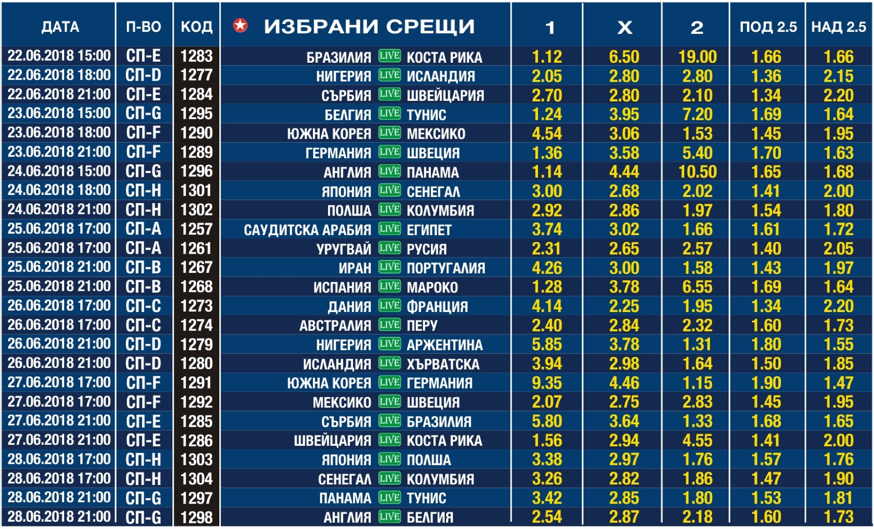 Ето още от българския букмейкър и програмата на Мондиала в идните дни: