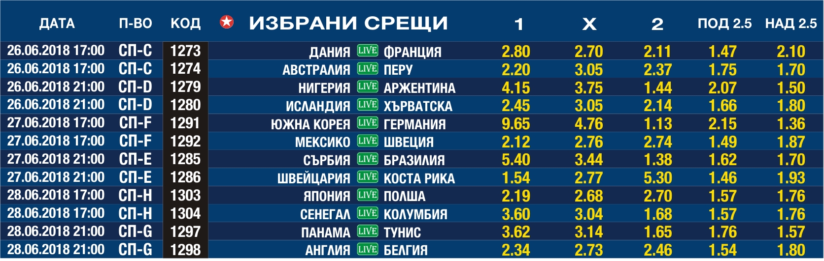 Ето още от българския букмейкър и програмата на Мондиала в идните дни: