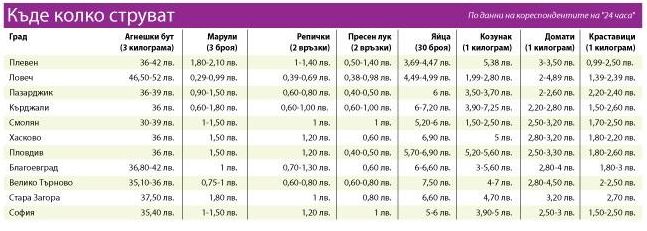 София /КРОСС/ Великденската трапеза излиза по-евтино в малките градове, показа проучване на "24 часа". В Смолян миникошницата за четиричленно семейство струва 44 лв., докато в столицата същите продукти са 53 лв. Причината - в Родопите може да се намери агнешко по 10 лв./кг, а в София цената е поне с 2 лв. повече. Всъщност във всеки град има доста големи разлики в цените на продуктите. Оказа се, че при повече обикаляне могат да се спестят до 30 на сто Сравнихме цените на 3 кг агнешки бут, 30 яйца, 1 кг козунак, 3 марули, по 2 връзки репички и пресен лук и по 1 кг домати и краставици.