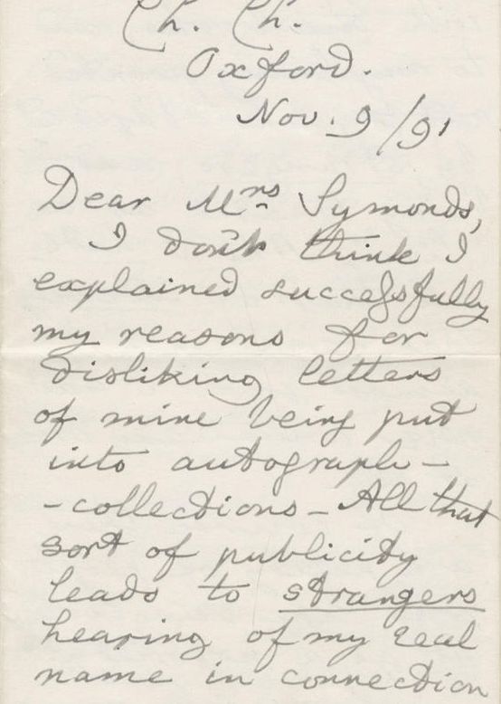 В него Доджсън пише, че мрази, когато писмата му отиват в частни колекции или когато непознати припознават в него Луис Карол.