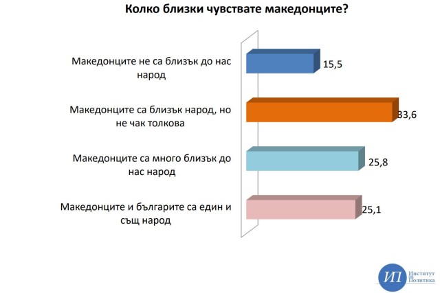 /КРОСС/ 51% от българите смятат, че с жителите на Македония сме или два близки народа, или част от един общ. Това показват данни от изследване на Института за политика. Най-позитивни са нагласите във възрастовите групи 26-35 г. и над 65 г.