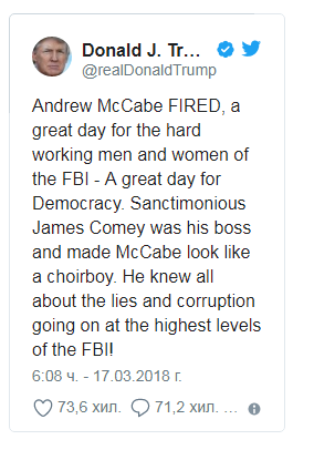 /КРОСС/ Президентът на САЩ Доналд Тръмп изрази задоволство от уволнението на бившия заместник-директор на ФБР Андрю Маккейб, като го нарече в Туитър "голям ден за демокрацията''.