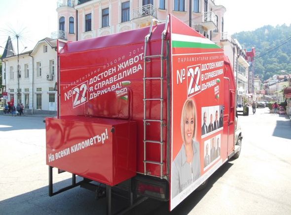 Кюстендил /КРОСС/ Водачът на листата на "БСП- Лява България" в Кюстендилски избирателен район Мая Манолова се качи на "кемпер" и тръгна на обиколка в областта. От едната му страна са представени кандидатите за депутати от листата, а от другата на карта на областта са показани снимки от обектите, които са изградени или са в процес на строеж, благодарение на усилията на Мая Манолова. Надпис "На всеки километър" стои на задната част на кемпера.