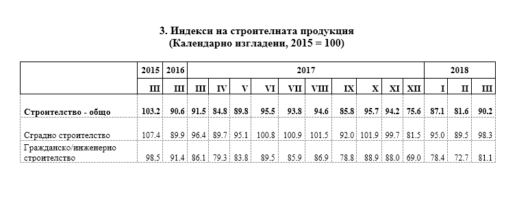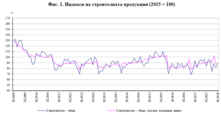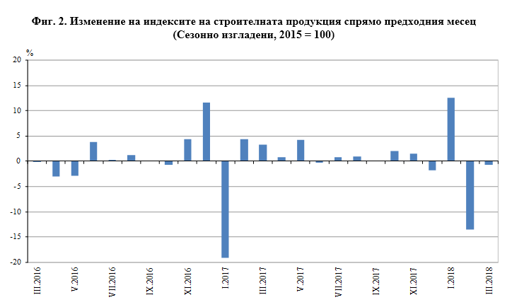 През март 2018 г. индексът на произведената строителна продукция, изчислен от сезонно изгладени данни, е под равнището от предходния месец, като намалението на продукцията от гражданското/инженерното строителство е с 1.1%, а от сградното строителство - с 0.3%.