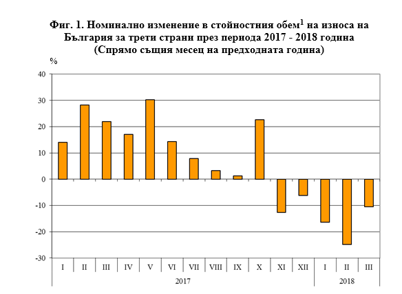 НСИ: През периода януари - март 2018 г. износът на България за трети страни намалява със 17.4%